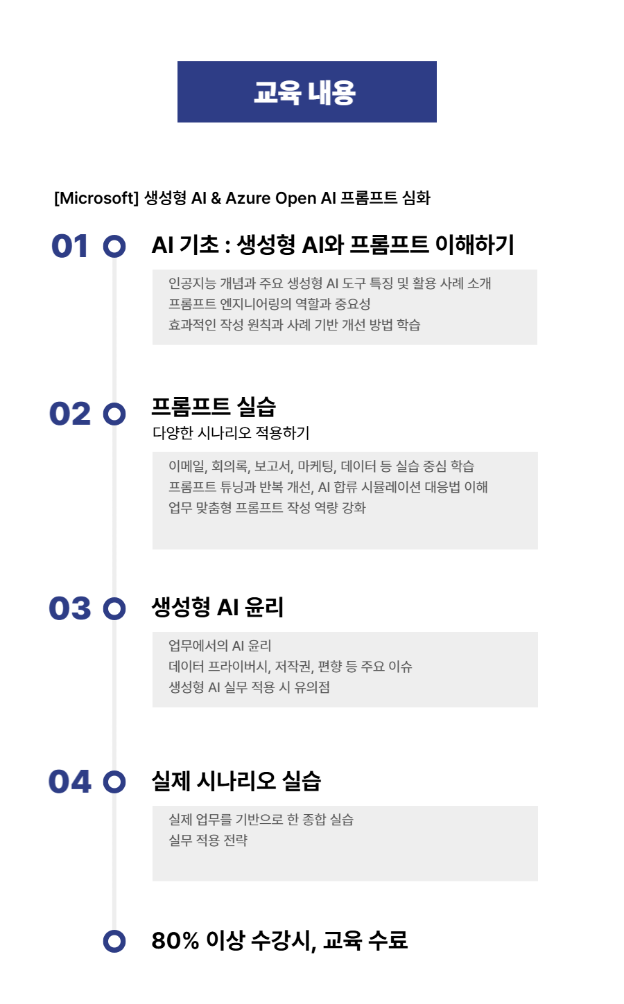 생성형 AI의 개념, 주요 도구 소개, 프롬프트 작성 원리, 다양한 AI 활용법, 실무 시나리오 실습, 윤리적 고려사항 등