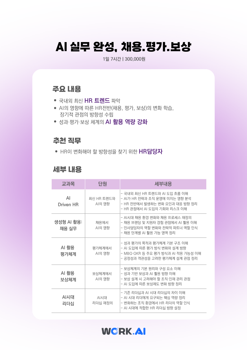 · AI의 영향에 따른 HR전반(채용, 평가, 보상)의 변화 학습, 장기적 관점의 방향성 수립